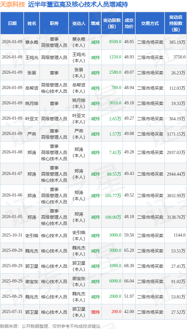 天奈科技近半年内的董监高及核心技术人员增减持详情如下: