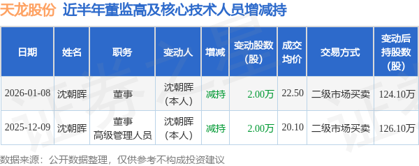 证券之星消息,根据1月12日市场公开信息、上市公司公告及交易所披露数据整理,天龙股份(603266)最新董监高及相关人员股份变动情况:2026年1月8日公司董事沈朝晖共减持公司股份2.0万股,占公司总股本为0.0101%。变动期间公司股价下跌0.13%,1月8日当日收盘报22.35元。