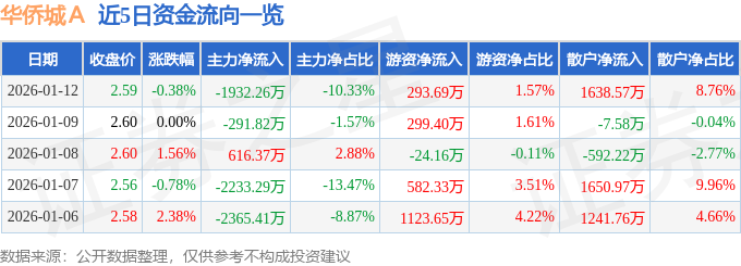 证券之星消息,截至2026年1月12日收盘,华侨城A(000069)报收于2.59元,下跌0.38%,换手率1.05%,成交量72.38万手,成交额1.87亿元。