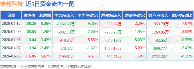 证券之星消息,截至2026年1月12日收盘,捷邦科技(301326)报收于108.26元,下跌0.36%,换手率4.58%,成交量1.25万手,成交额1.35亿元。