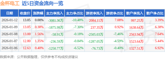 证券之星消息,截至2026年1月12日收盘,金杯电工(002533)报收于13.05元,上涨0.0%,换手率3.56%,成交量22.67万手,成交额2.94亿元。