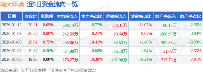 证券之星消息,截至2026年1月12日收盘,南大环境(300864)报收于20.21元,上涨0.05%,换手率1.07%,成交量1.69万手,成交额3417.18万元。