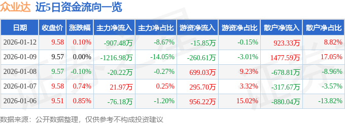 证券之星消息,截至2026年1月12日收盘,众业达(002441)报收于9.58元,上涨0.1%,换手率2.75%,成交量10.97万手,成交额1.05亿元。