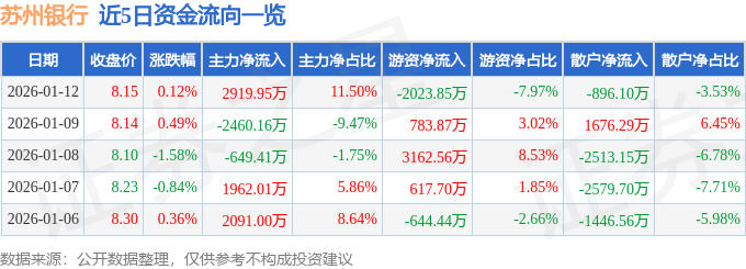 证券之星消息,截至2026年1月12日收盘,苏州银行(002966)报收于8.15元,上涨0.12%,换手率0.71%,成交量31.23万手,成交额2.54亿元。