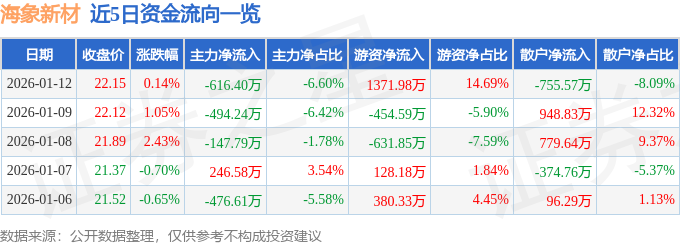 1月12日的资金流向数据方面,主力资金净流出616.4万元,占总成交额6.6%,游资资金净流入1371.98万元,占总成交额14.69%,散户资金净流出755.57万元,占总成交额8.09%。