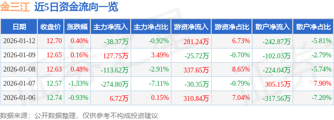 1月12日的资金流向数据方面,主力资金净流出38.37万元,占总成交额0.92%,游资资金净流入281.24万元,占总成交额6.73%,散户资金净流出242.87万元,占总成交额5.81%。