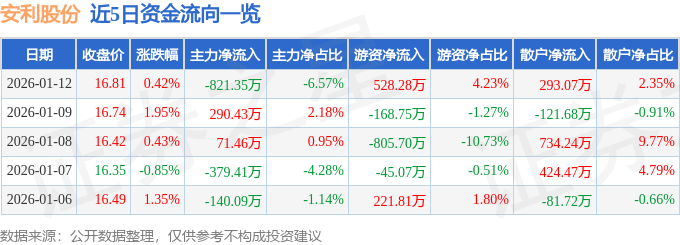 证券之星消息,截至2026年1月12日收盘,安利股份(300218)报收于16.81元,上涨0.42%,换手率3.44%,成交量7.44万手,成交额1.25亿元。