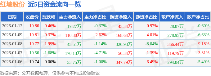 证券之星消息,截至2026年1月12日收盘,红墙股份(002809)报收于10.86元,上涨0.46%,换手率3.08%,成交量4.29万手,成交额4657.32万元。