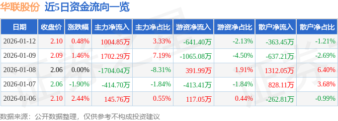 1月12日的资金流向数据方面,主力资金净流入1004.85万元,占总成交额3.33%,游资资金净流出641.4万元,占总成交额2.13%,散户资金净流出363.45万元,占总成交额1.21%。