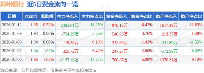 证券之星消息,截至2026年1月12日收盘,郑州银行(002936)报收于1.95元,上涨0.52%,换手率1.0%,成交量70.43万手,成交额1.37亿元。