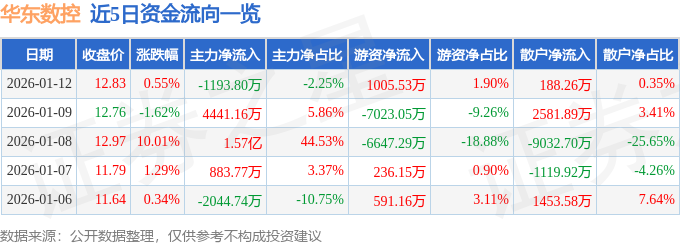证券之星消息,截至2026年1月12日收盘,华东数控(002248)报收于12.83元,上涨0.55%,换手率13.51%,成交量41.55万手,成交额5.31亿元。