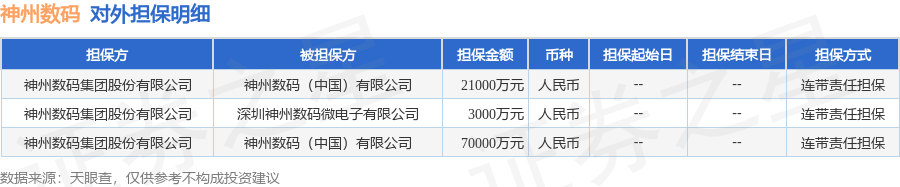 神州数码1月9日披露3笔对外担保,被担保公司2家。对外担保明细如下表:
