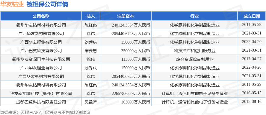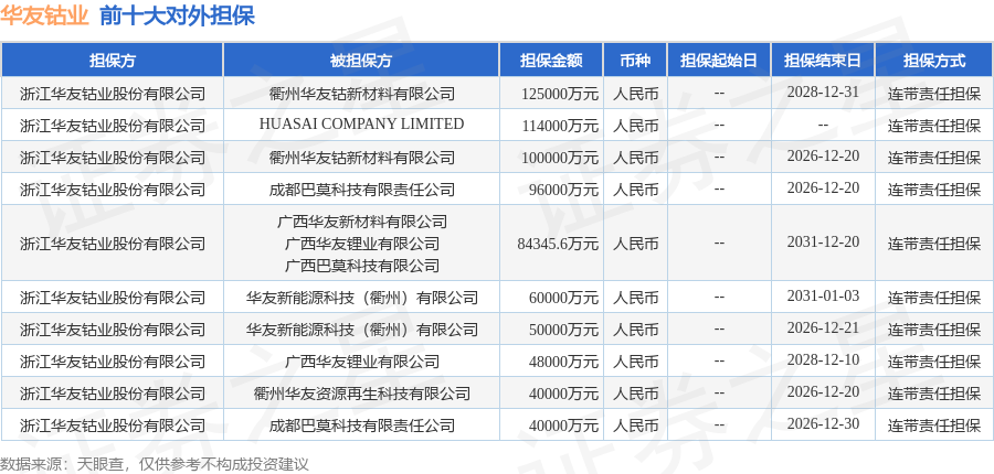 华友钴业1月9日披露23笔对外担保,被担保公司17家。担保金额排在前十的对外担保明细如下表: