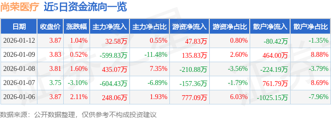 证券之星消息,截至2026年1月12日收盘,尚荣医疗(002551)报收于3.87元,上涨1.04%,换手率2.54%,成交量15.5万手,成交额5963.89万元。