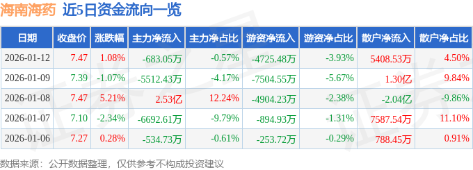 证券之星消息,截至2026年1月12日收盘,海南海药(000566)报收于7.47元,上涨1.08%,换手率12.39%,成交量160.64万手,成交额12.03亿元。