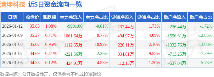 证券之星消息,截至2026年1月12日收盘,满坤科技(301132)报收于35.65元,上涨1.08%,换手率4.11%,成交量3.89万手,成交额1.38亿元。