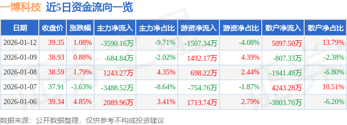 证券之星消息,截至2026年1月12日收盘,一博科技(301366)报收于39.35元,上涨1.08%,换手率12.36%,成交量9.43万手,成交额3.7亿元。