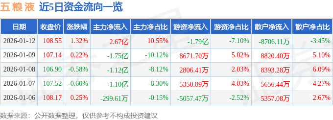 证券之星消息,截至2026年1月12日收盘,五 粮 液(000858)报收于108.55元,上涨1.32%,换手率0.6%,成交量23.34万手,成交额25.27亿元。
