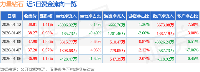 证券之星消息,截至2026年1月12日收盘,力量钻石(301071)报收于38.81元,上涨1.41%,换手率6.56%,成交量12.77万手,成交额4.9亿元。