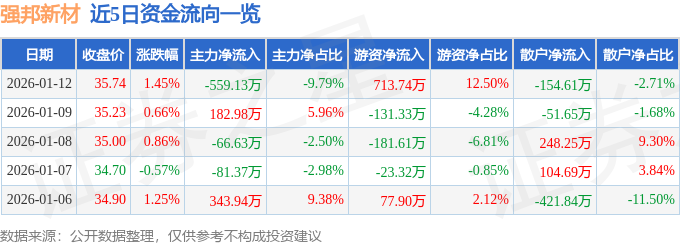 证券之星消息,截至2026年1月12日收盘,强邦新材(001279)报收于35.74元,上涨1.45%,换手率4.0%,成交量1.6万手,成交额5711.33万元。