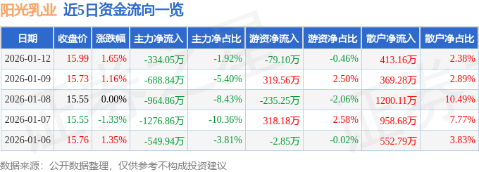 证券之星消息,截至2026年1月12日收盘,阳光乳业(001318)报收于15.99元,上涨1.65%,换手率3.88%,成交量10.95万手,成交额1.74亿元。