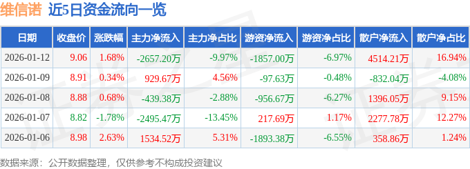 证券之星消息,截至2026年1月12日收盘,维信诺(002387)报收于9.06元,上涨1.68%,换手率2.12%,成交量29.57万手,成交额2.66亿元。