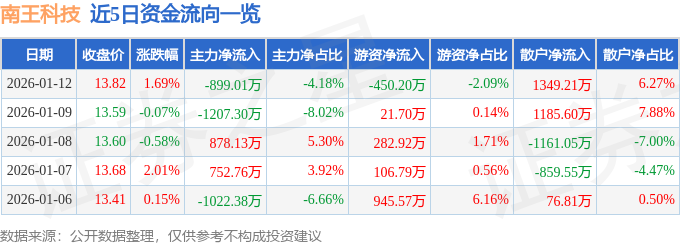 证券之星消息,截至2026年1月12日收盘,南王科技(301355)报收于13.82元,上涨1.69%,换手率15.63%,成交量15.66万手,成交额2.15亿元。