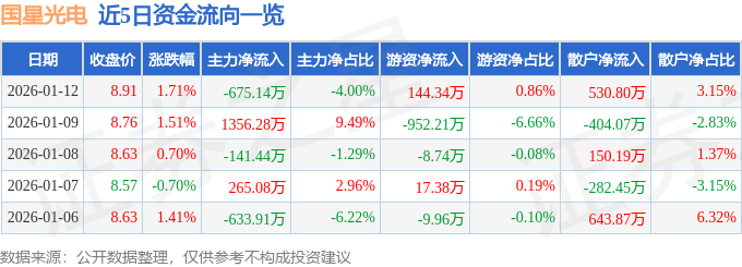证券之星消息,截至2026年1月12日收盘,国星光电(002449)报收于8.91元,上涨1.71%,换手率3.09%,成交量19.14万手,成交额1.69亿元。