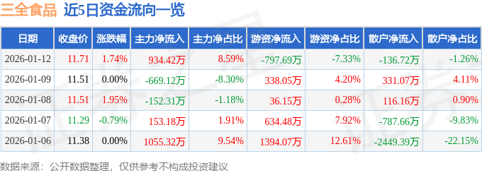 证券之星消息,截至2026年1月12日收盘,三全食品(002216)报收于11.71元,上涨1.74%,换手率1.48%,成交量9.33万手,成交额1.09亿元。