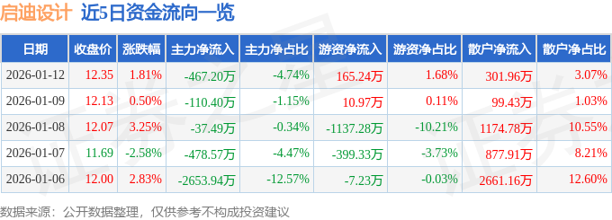 证券之星消息,截至2026年1月12日收盘,启迪设计(300500)报收于12.35元,上涨1.81%,换手率4.8%,成交量8.05万手,成交额9851.19万元。