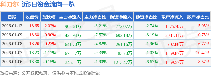 证券之星消息,截至2026年1月12日收盘,科力尔(002892)报收于13.65元,上涨2.02%,换手率4.3%,成交量20.8万手,成交额2.81亿元。