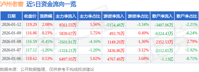 证券之星消息,截至2026年1月12日收盘,泸州老窖(000568)报收于119.29元,上涨2.08%,换手率0.88%,成交量12.96万手,成交额15.41亿元。