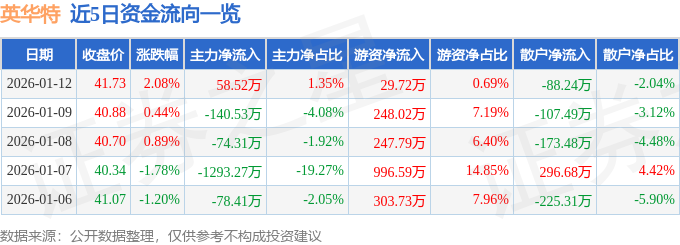 1月12日的资金流向数据方面,主力资金净流入58.52万元,占总成交额1.35%,游资资金净流入29.72万元,占总成交额0.69%,散户资金净流出88.24万元,占总成交额2.04%。