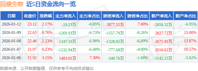 证券之星消息,截至2026年1月12日收盘,回盛生物(300871)报收于23.12元,上涨2.17%,换手率8.93%,成交量18.08万手,成交额4.11亿元。