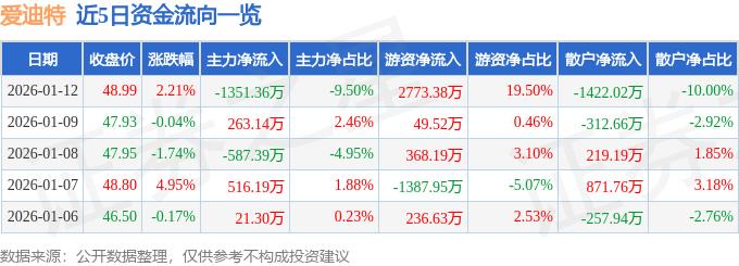 1月12日的资金流向数据方面,主力资金净流出1351.36万元,占总成交额9.5%,游资资金净流入2773.38万元,占总成交额19.5%,散户资金净流出1422.02万元,占总成交额10.0%。