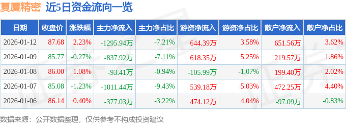 证券之星消息,截至2026年1月12日收盘,夏厦精密(001306)报收于87.68元,上涨2.23%,换手率13.42%,成交量2.08万手,成交额1.8亿元。