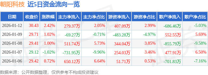 证券之星消息,截至2026年1月12日收盘,朝阳科技(002981)报收于30.43元,上涨2.42%,换手率3.79%,成交量4.53万手,成交额1.36亿元。