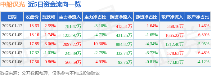 证券之星消息,截至2026年1月12日收盘,中船汉光(300847)报收于18.63元,上涨2.59%,换手率4.6%,成交量13.63万手,成交额2.52亿元。
