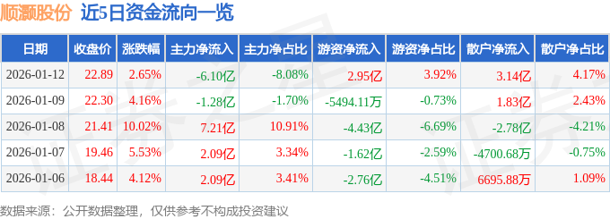 证券之星消息,截至2026年1月12日收盘,顺灏股份(002565)报收于22.89元,上涨2.65%,换手率31.37%,成交量332.46万手,成交额75.4亿元。