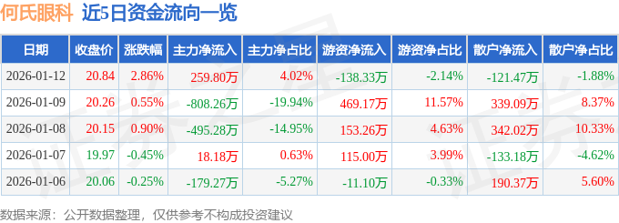 证券之星消息,截至2026年1月12日收盘,何氏眼科(301103)报收于20.84元,上涨2.86%,换手率1.99%,成交量3.14万手,成交额6458.06万元。