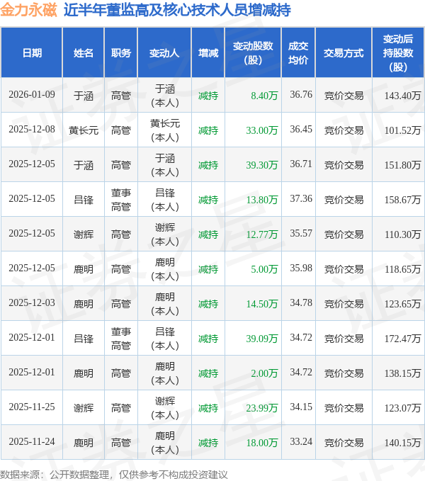 金力永磁近半年内的董监高及核心技术人员增减持详情如下: