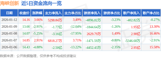 证券之星消息,截至2026年1月12日收盘,海峡创新(300300)报收于14.16元,上涨3.66%,换手率16.36%,成交量109.06万手,成交额15.17亿元。