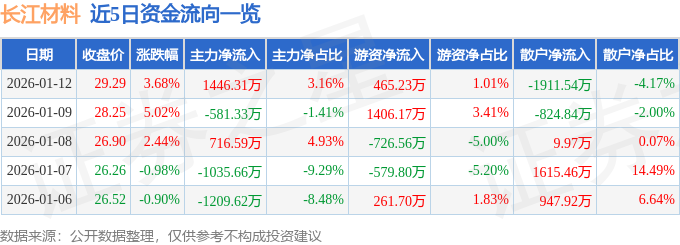 证券之星消息,截至2026年1月12日收盘,长江材料(001296)报收于29.29元,上涨3.68%,换手率20.47%,成交量15.73万手,成交额4.58亿元。