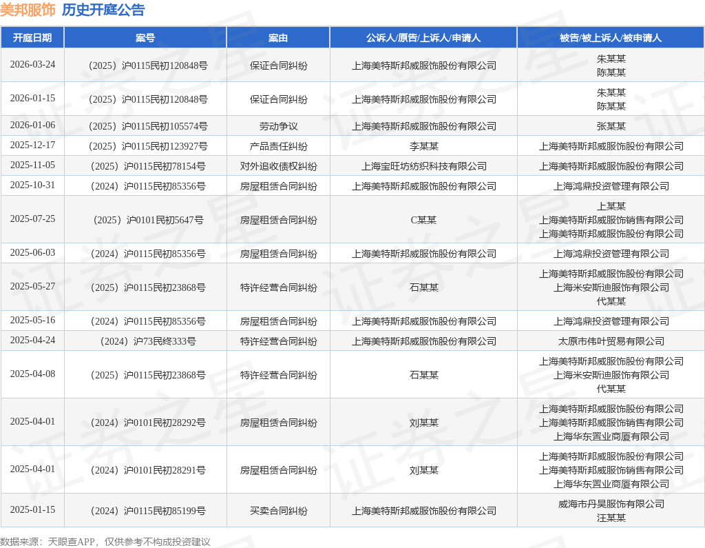 案号:(2025)沪0115民初120848号根据统计,近一年内以上海美特斯邦威服饰股份有限公司为当事人的历史开庭公告有15则,其中案由为“房屋租赁合同纠纷”的公告以6则居首,其次为“特许经营合同纠纷”有3则,“保证合同纠纷”有2则。历史开庭公告如下: