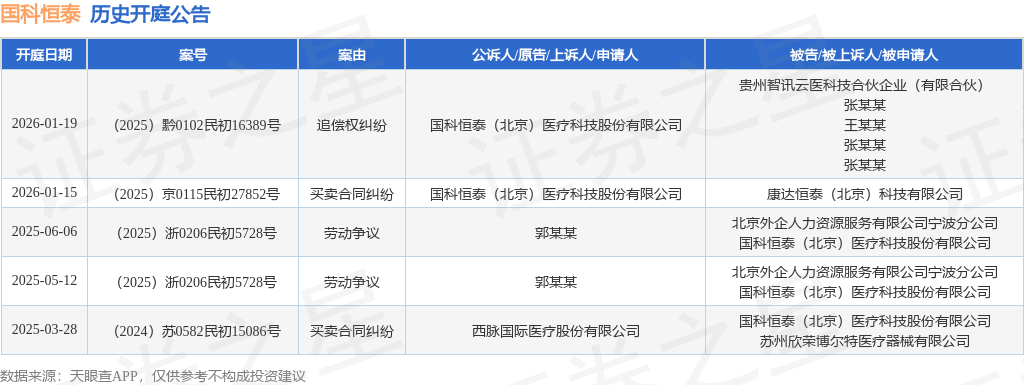 案号:(2025)京0115民初27852号根据统计,近一年内以国科恒泰(北京)医疗科技股份有限公司为当事人的历史开庭公告有5则,其中案由为“买卖合同纠纷”的公告以2则居首,其次为“劳动争议”有2则,“追偿权纠纷”有1则。历史开庭公告如下:
