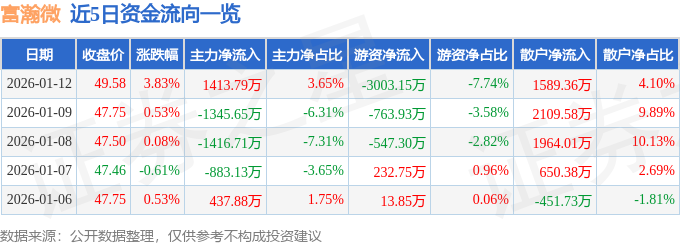 1月12日的资金流向数据方面,主力资金净流入1413.79万元,占总成交额3.65%,游资资金净流出3003.15万元,占总成交额7.74%,散户资金净流入1589.36万元,占总成交额4.1%。