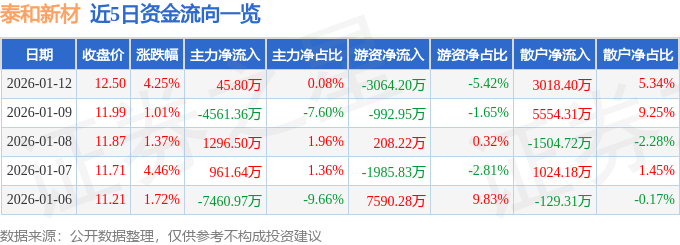 证券之星消息,截至2026年1月12日收盘,泰和新材(002254)报收于12.5元,上涨4.25%,换手率5.6%,成交量45.88万手,成交额5.65亿元。