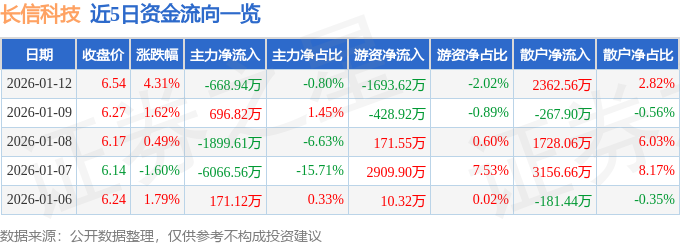 证券之星消息,截至2026年1月12日收盘,长信科技(300088)报收于6.54元,上涨4.31%,换手率5.22%,成交量129.82万手,成交额8.38亿元。