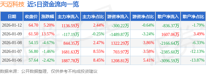 证券之星消息,截至2026年1月12日收盘,天迈科技(300807)报收于64.7元,上涨5.2%,换手率14.26%,成交量7.41万手,成交额4.66亿元。