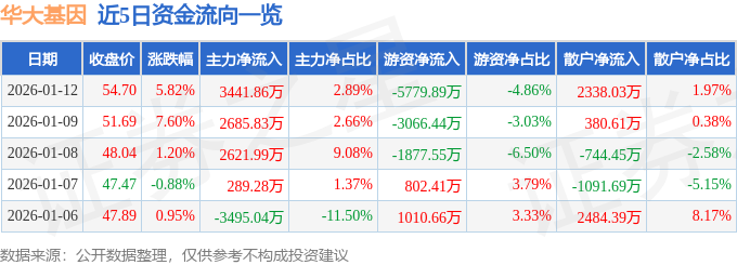 证券之星消息,截至2026年1月12日收盘,华大基因(300676)报收于54.7元,上涨5.82%,换手率5.33%,成交量22.19万手,成交额11.9亿元。